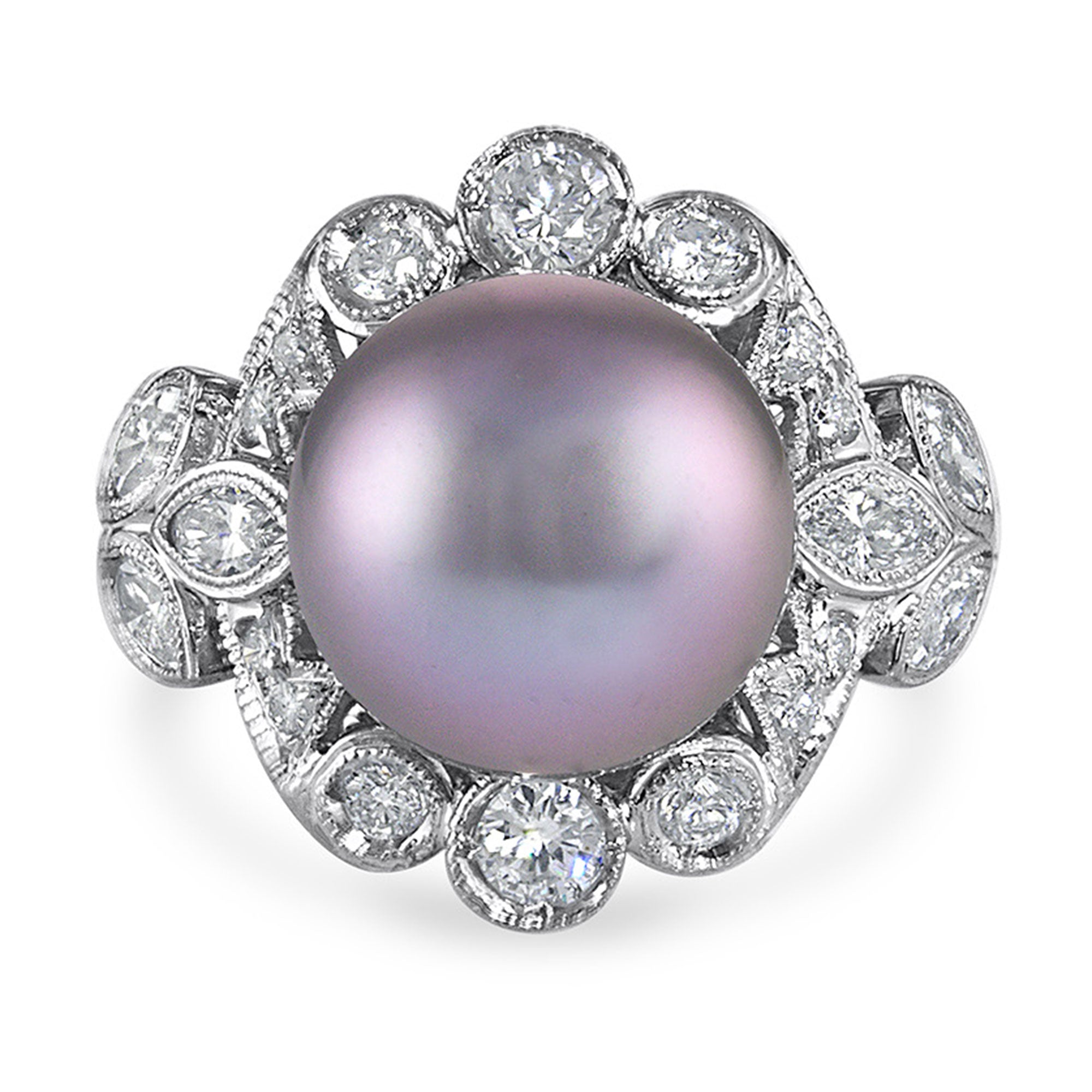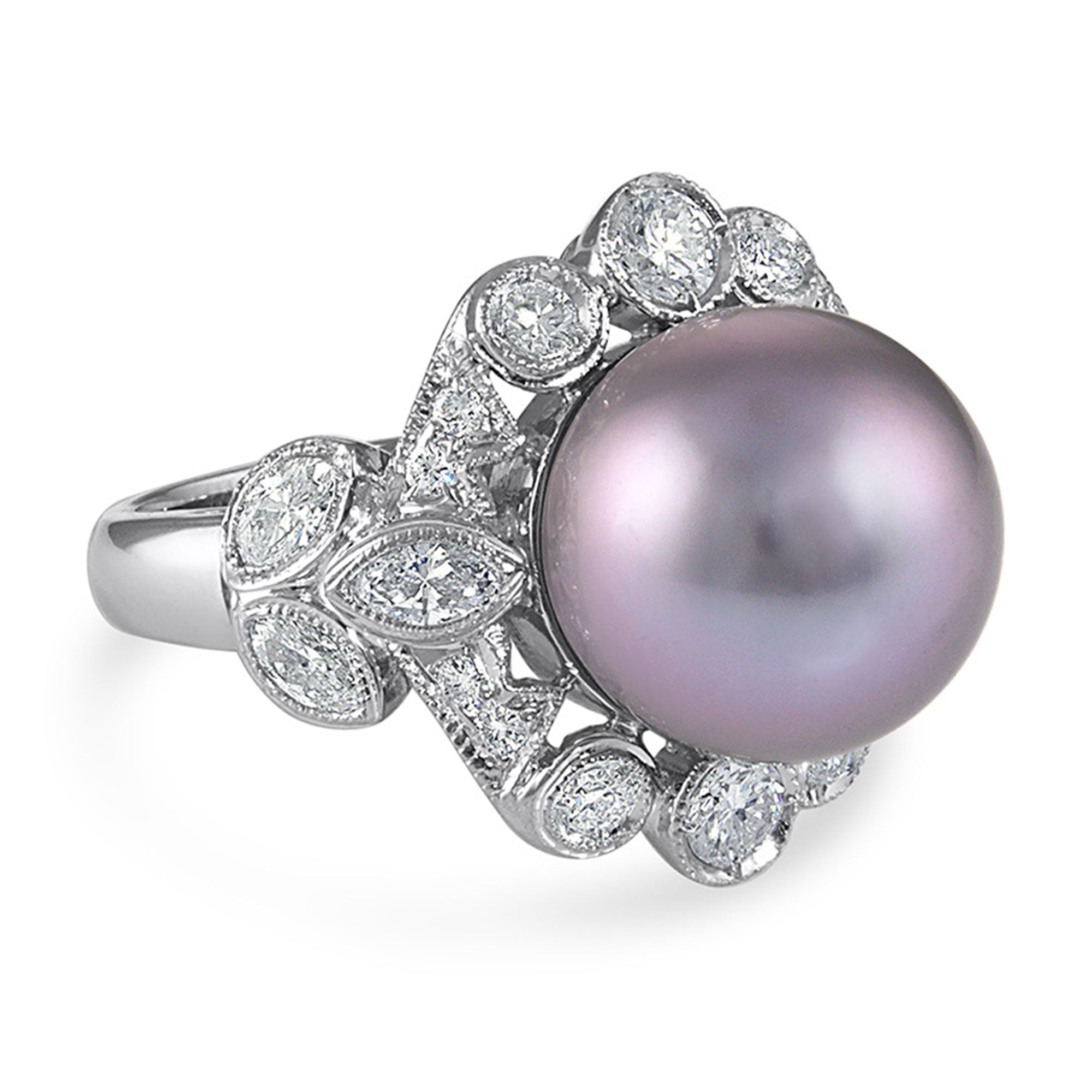 Custom designed and created for our customer who purchased our magnificent Estate South Sea Pearl & Diamond Ring, these South Sea Pearl & Diamond Earrings feature 12mm silver South Sea Pearls with iridescent flashes of purple. Suspended from gleaming White Gold chains, these lustrous Pearls are cradled in over ½ ctw. of Diamonds. Hanging 1 ½ inches long, these earrings are the perfect companion to her one-of-a-kind ring.